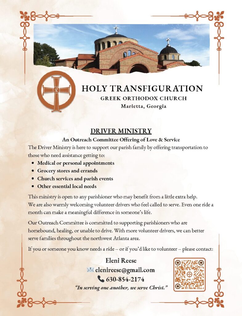 The Driver Ministry is here to support our parish family by offering transportation to those who need assistance getting to: Medical or personal appointments, Grocery stores and errands, Church services and parish events, and other essential local needs. This ministry is open to any parishioner who may benefit from a little extra help. We are also warmly welcoming volunteer drivers who feel called to serve. Even one ride a month can make a meaningful difference in someone’s life. If you or someone you know needs a ride — or if you’d like to volunteer — please contact Eleni Reese, elenireese@gmail.com, or 630-854-2174.